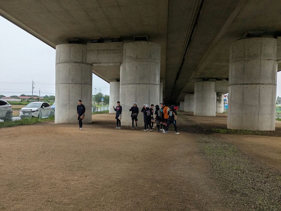 さて、気持ちを切り替えて練習…と思ったところで、まさかの大雨。急きょ場所を高架橋下へ移し、小学生は全国大会へ向けて、中学生は全国予選に向けて、限られた時間の中で小中合同の貴重な練習を行いました。